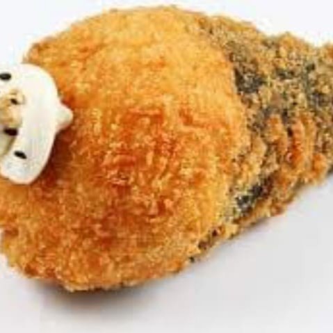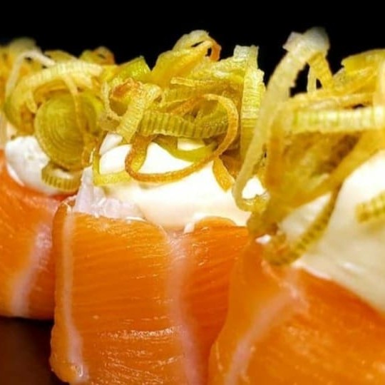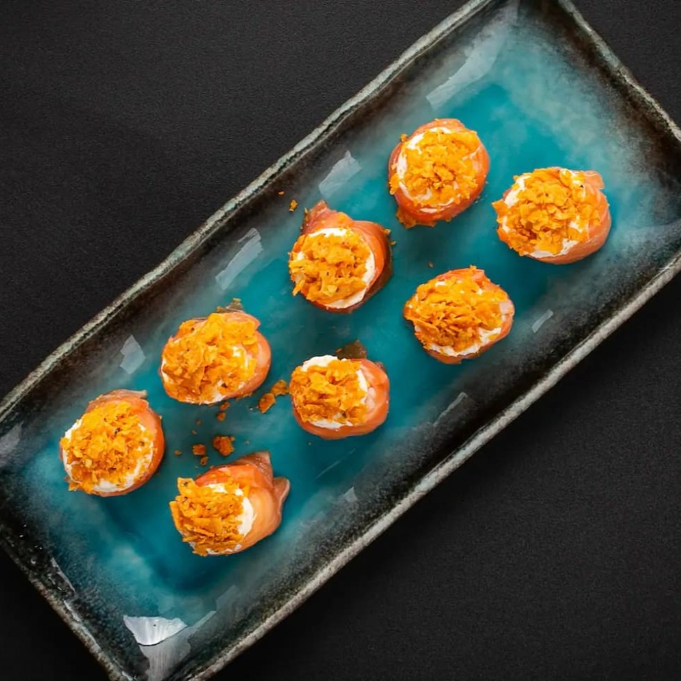 Bolinho de arroz envolvido em fatia de salmão e creme cheese e pedaço de Doritos.