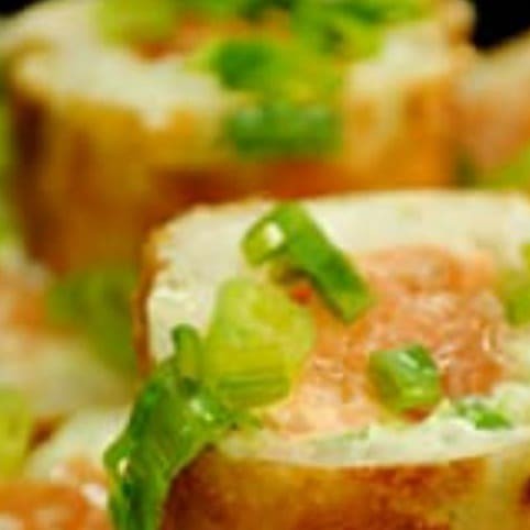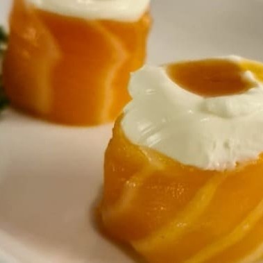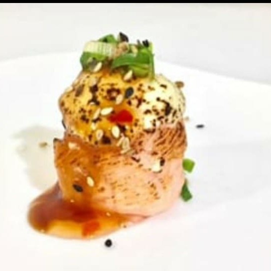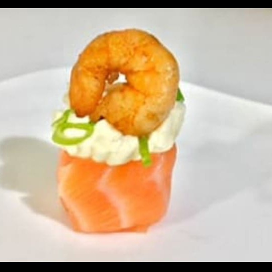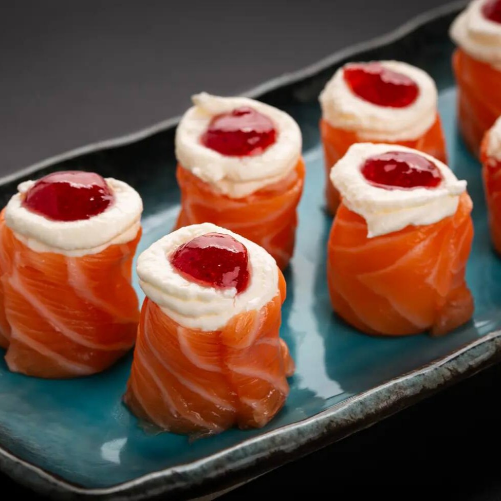 Bolinho de arroz, envolvido com fatia de salmão com creme cheese e sinalizando com geleia pimenta.