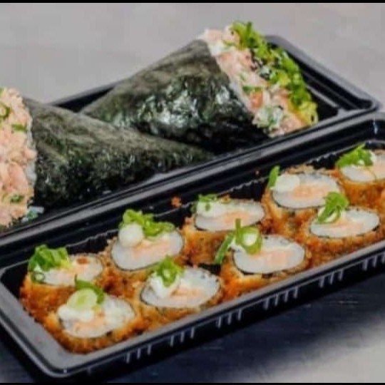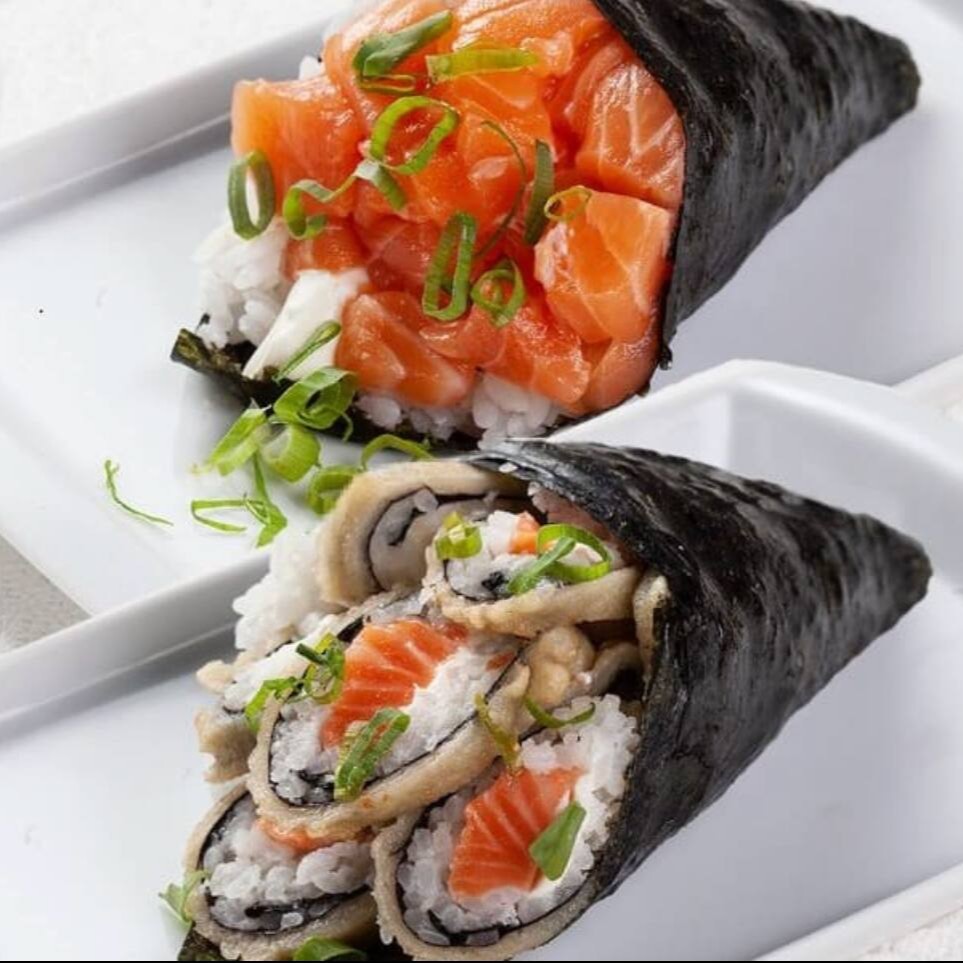 1 temaki cru 1 temaki frito Arroz salmão cheme chesse e cebolinha