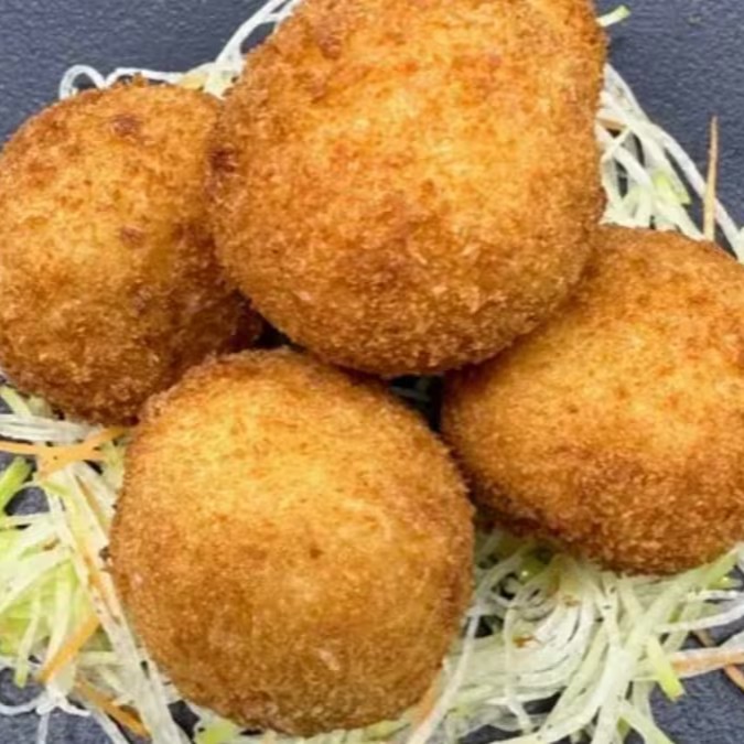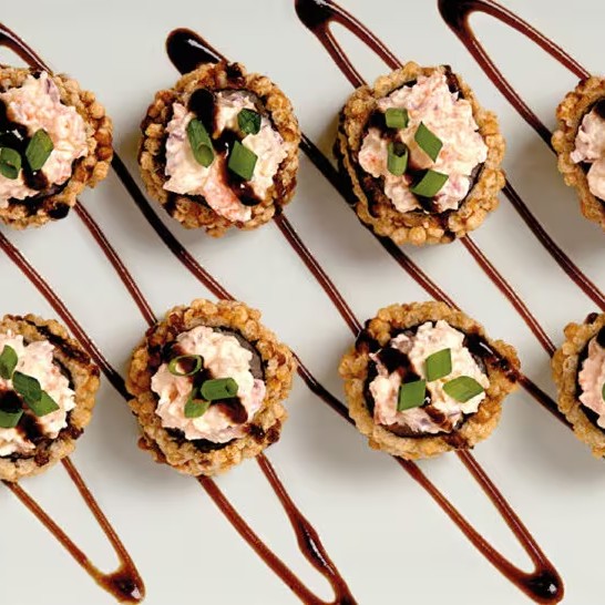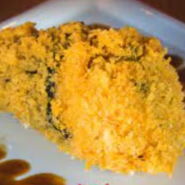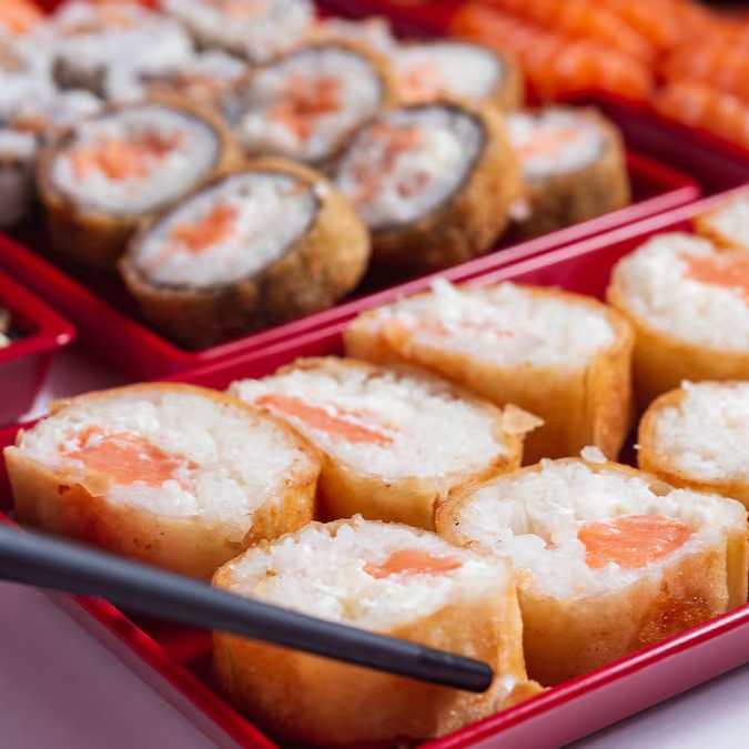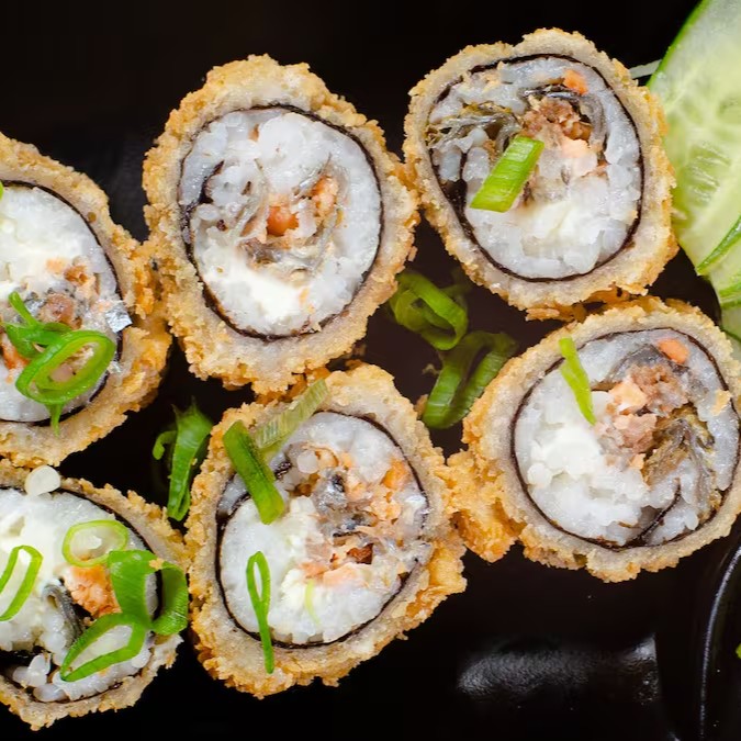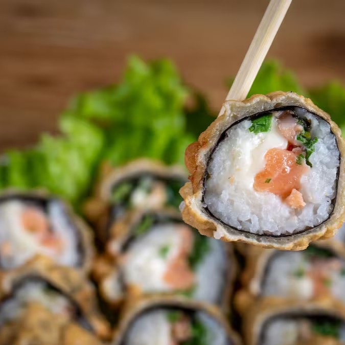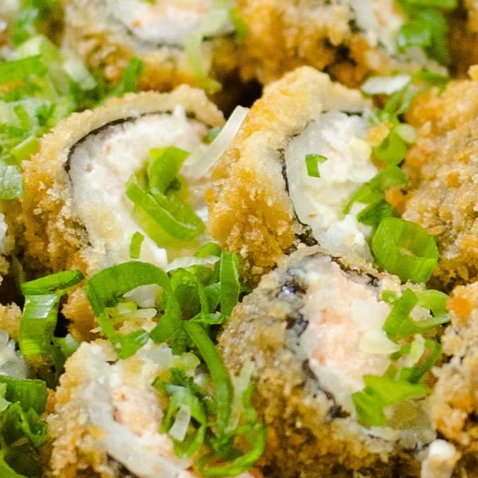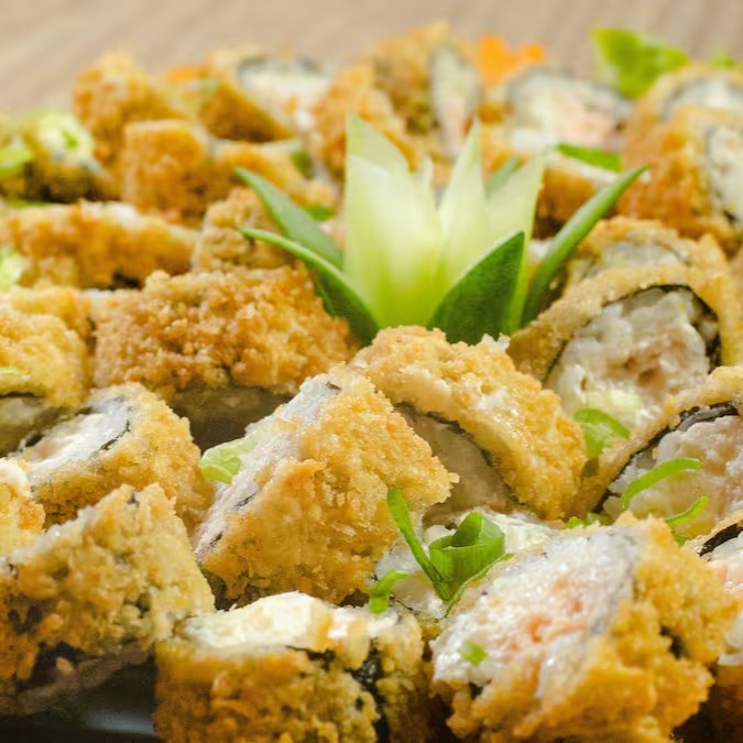 Alga nori, camarão, arroz japonês e cream cheese, coberto farinha panko e frito
