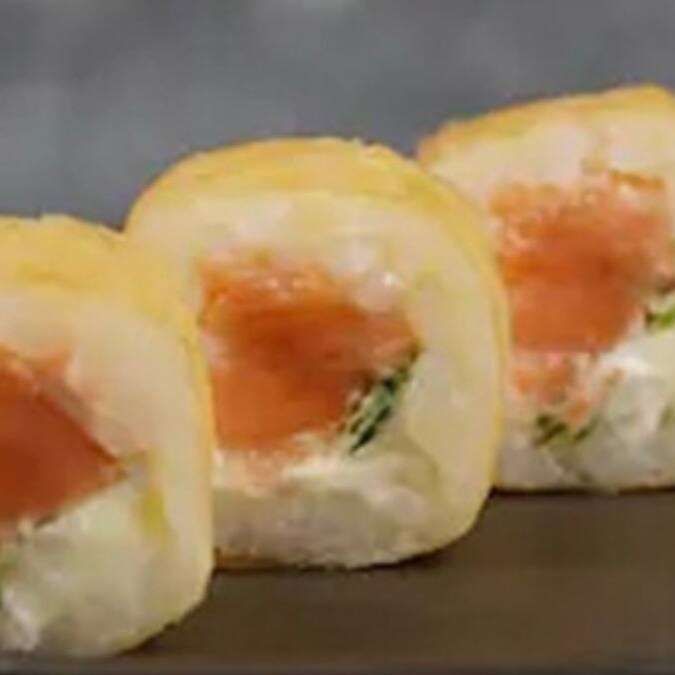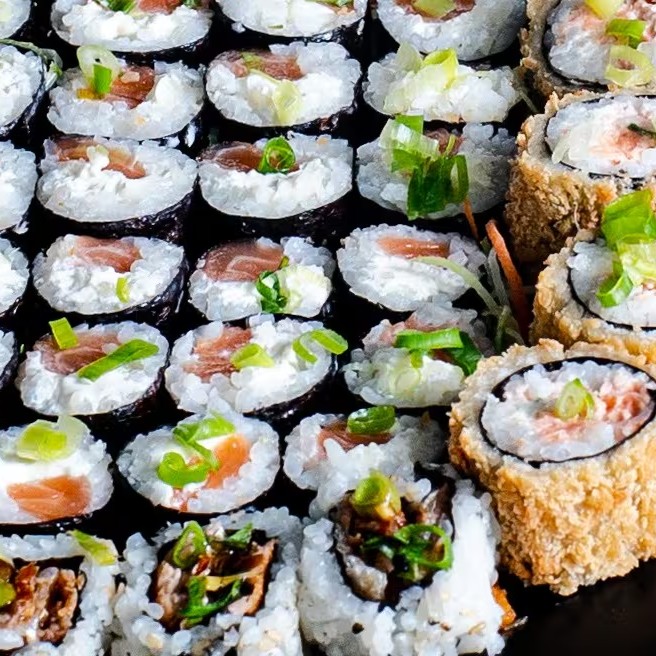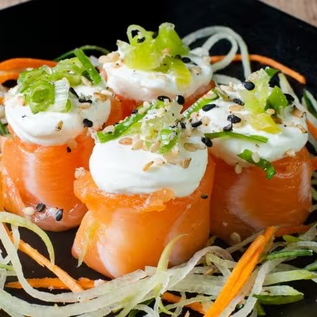 Arroz temperado, salmão, cream cheese, cebolinha e gergelim.