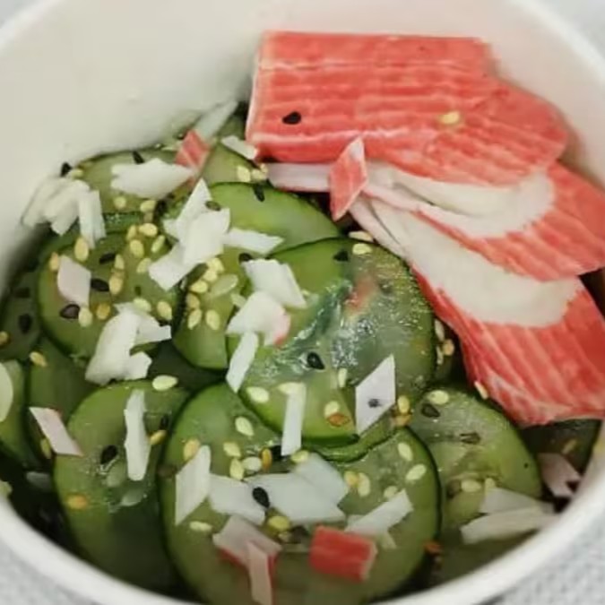 Alga nori, arroz temperado, manga, pepino e kani.