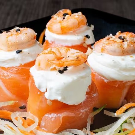 Arroz temperado, salmão, cream cheese, camarão.