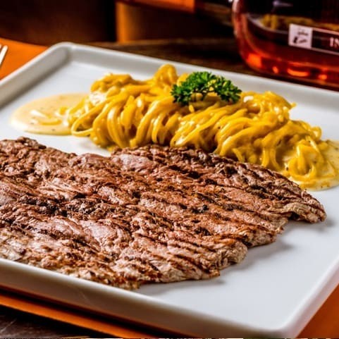 Saboreie o paillard de mignon, acompanhado de fettuccine e molho quatro queijos. Uma combinação clássica e sofisticada.