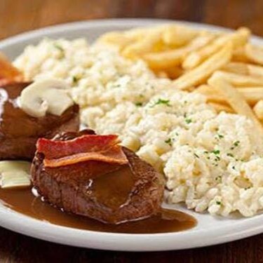 Deliciosa picanha Angus, acompanha farofa de ovos, arroz, fritas da casa e vinagrete.