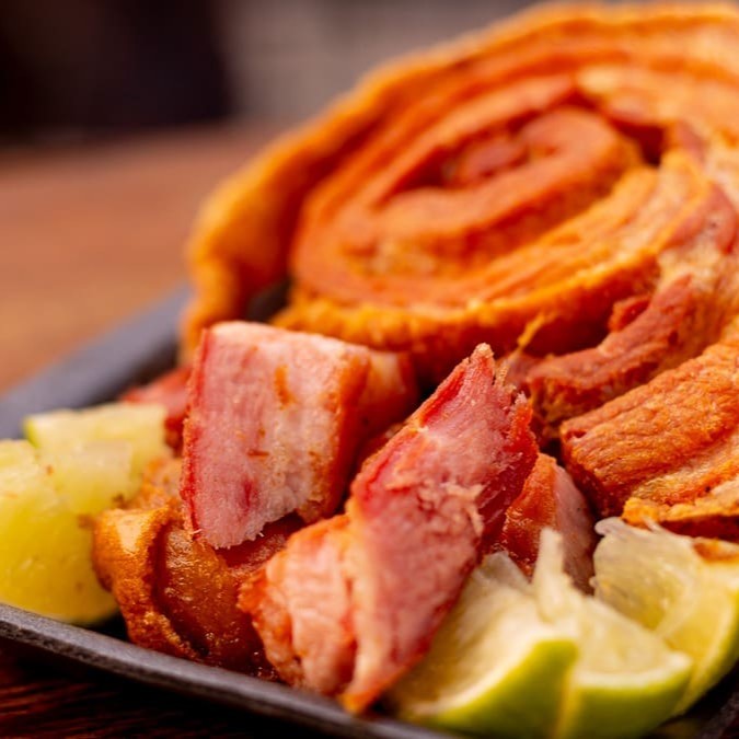 Torresmo crocante servido com molho de pimenta, perfeito para quem busca um petisco tradicional e picante.