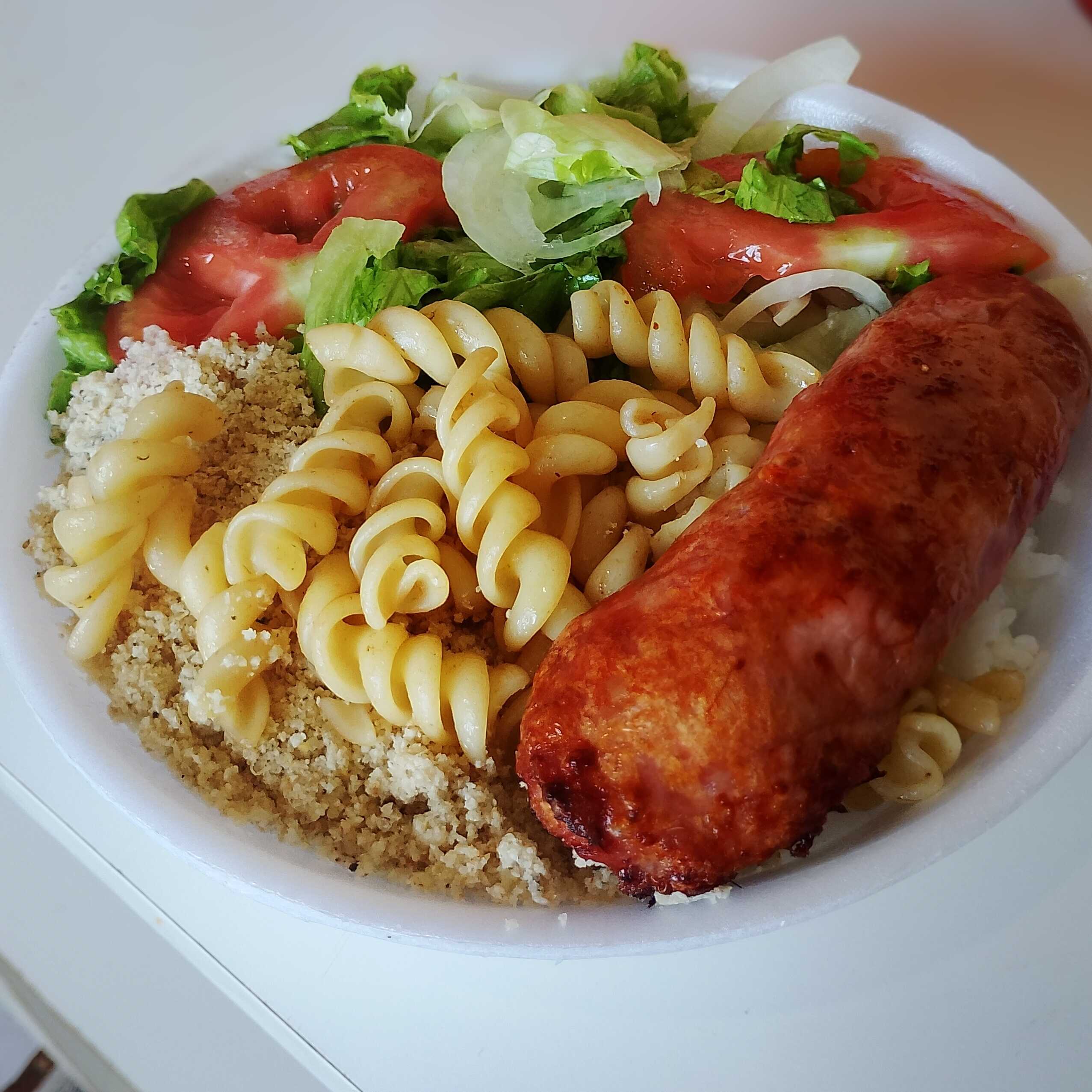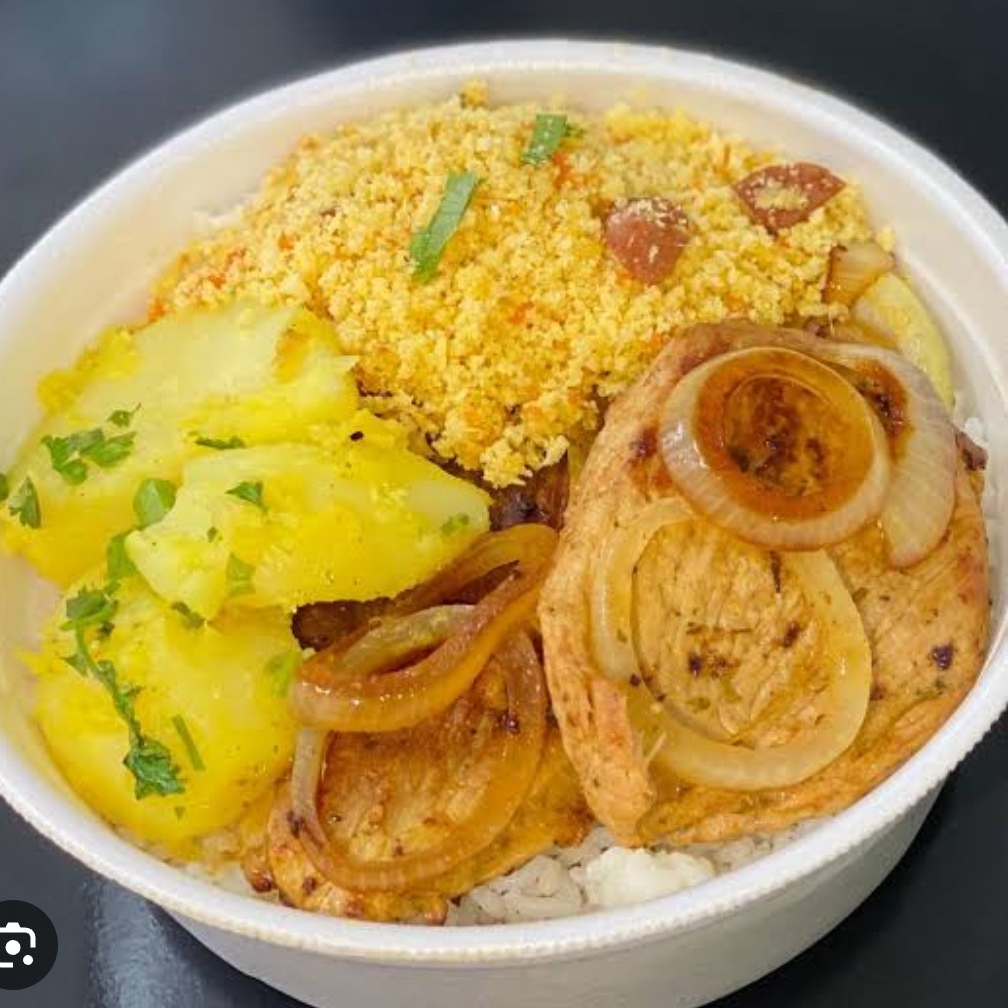 Arroz,feijão, macarrão,farofa,Toscana acebolada,batata corada