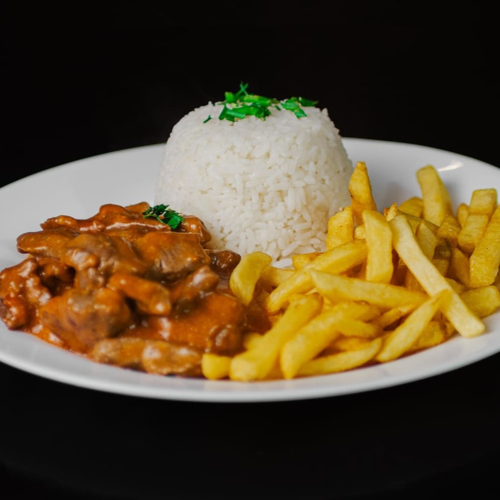 Apresentamos o Strogonoff de Carne, um clássico da culinária brasileira. Esta deliciosa marmita é composta por uma suculenta porção de Strogonoff, preparado com carne de alta qualidade, em um molho cremoso e cheio de sabor. Acompanha um arroz soltinho, perfeitamente cozido, e batatas fritas crocantes e douradas, que complementam a refeição de forma perfeita. Uma combinação irresistível que vai te