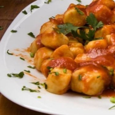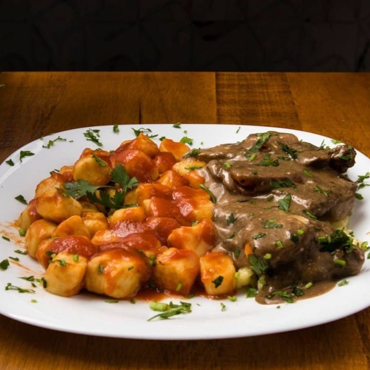 Apresentamos o Nhoque com Carne Assada. Este prato primorosamente executado, destaca-se por sua massa suave e delicada, meticulosamente preparada para conquistar os paladares mais exigentes. Acompanha ainda uma suculenta carne assada, que é lentamente cozida para atingir o ponto perfeito de sabor e textura. Infelizmente, não acompanha queijo ralado. Uma experiência gastronômica brasileira inesquec
