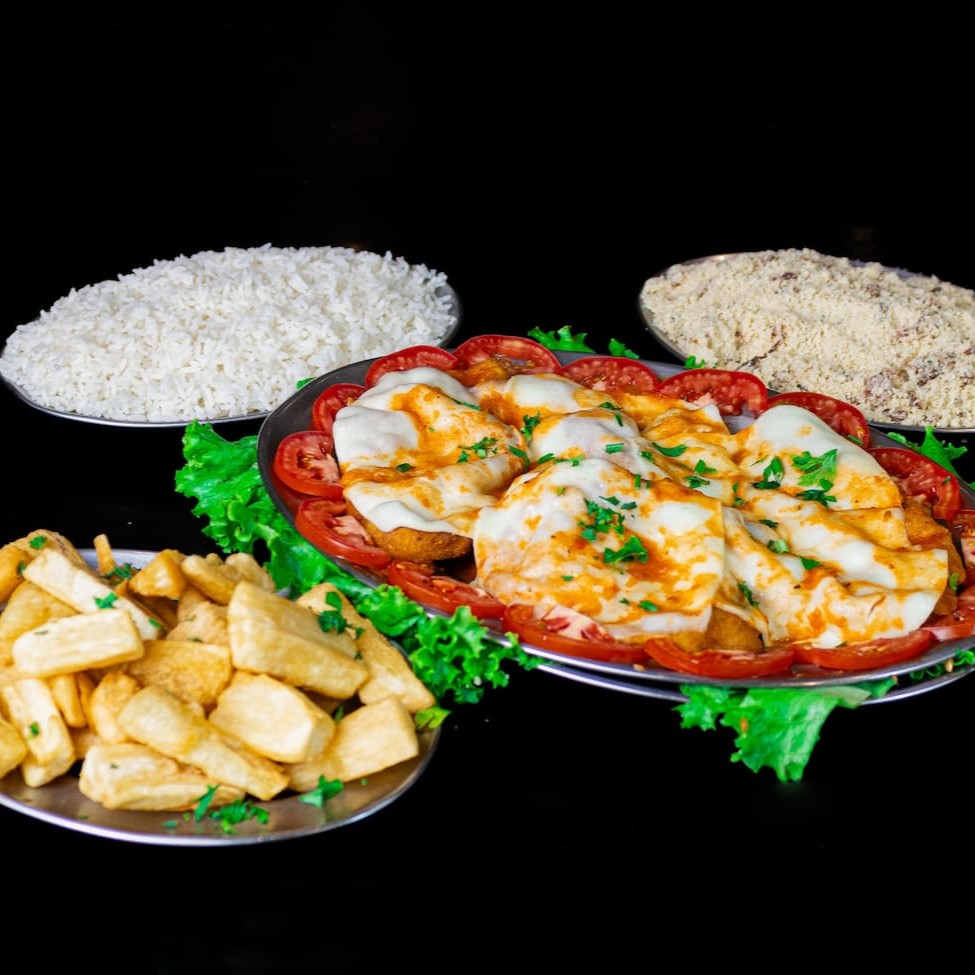 Apresentamos o Bife à Parmegiana, uma joia da culinária brasileira. Este prato é preparado cuidadosamente pelo nosso chef, que seleciona os melhores cortes de carne para garantir um bife suculento e saboroso. Coberto com queijo parmesão derretido e um molho de tomate caseiro, este prato promete uma experiência gastronômica única. Acompanha arroz fresco e bem temperado, feijão cozido ao ponto, bata