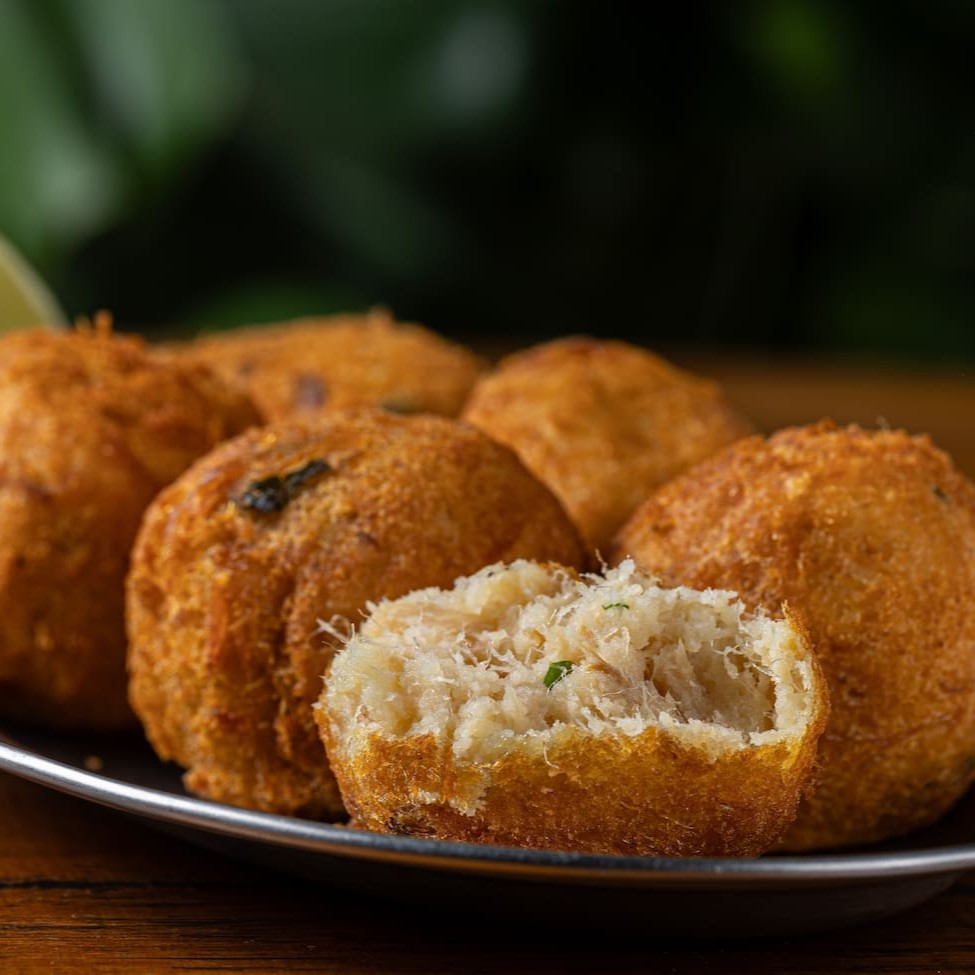 Desfrute de uma autêntica experiência gastronômica com o nosso Bolinho de Bacalhau. Este petisco português tradicional é meticulosamente preparado, utilizando bacalhau de primeira qualidade, proporcionando uma textura única e um sabor excepcional a cada mordida. Seu exterior crocante contrasta perfeitamente com o interior macio e recheado de sabor. É a opção ideal para começar sua refeição com um