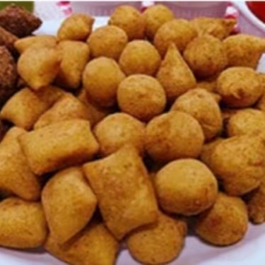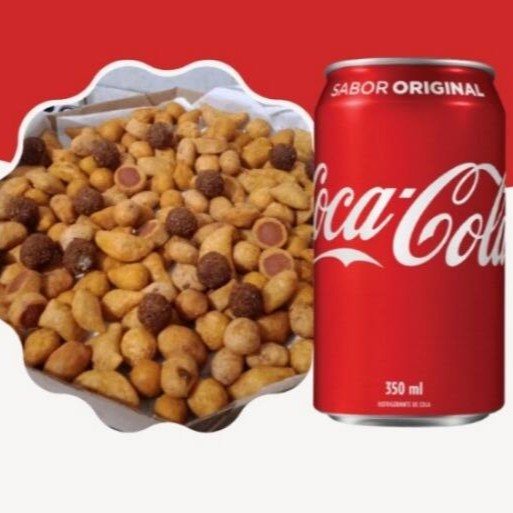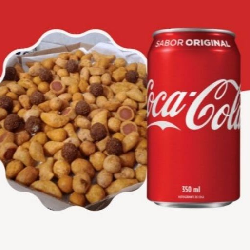 São 25 deliciosos salgados sequinhos e quentinhos (tamanho padrão de festa 15g) que fritamos na hora para sua experiencia ficar ainda melhor + 1 Coca-Cola Lata