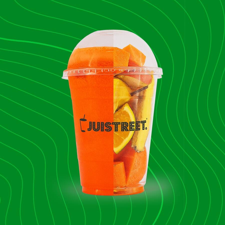 O queridinho do verão! Rico em betacaroteno e Vitamina C para a pele e imunidade. (Ingredientes: Cenoura, gengibre, laranja e maçã).