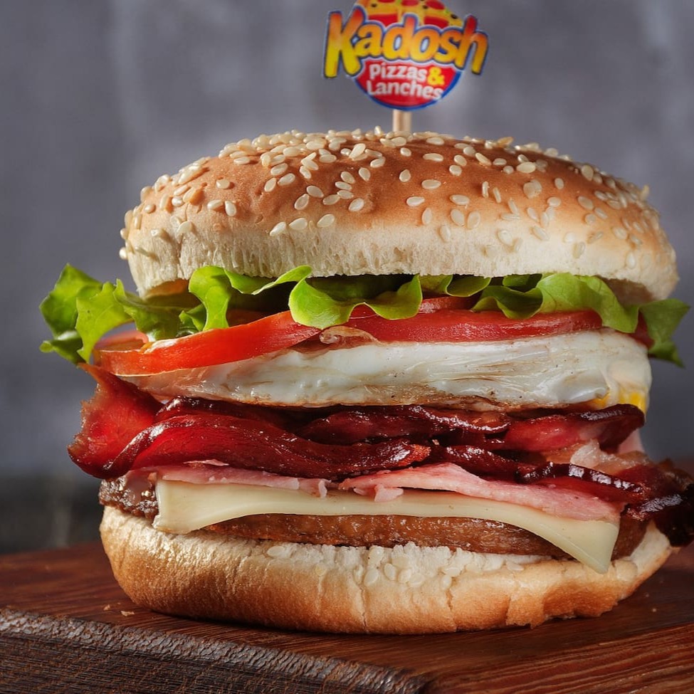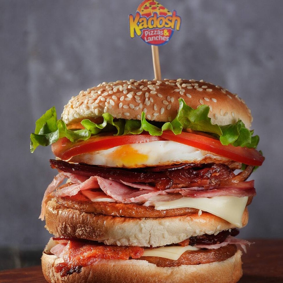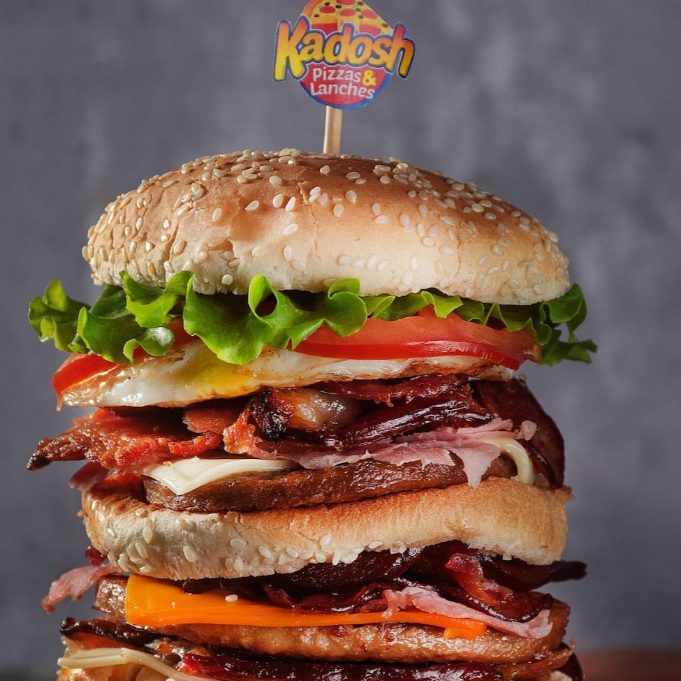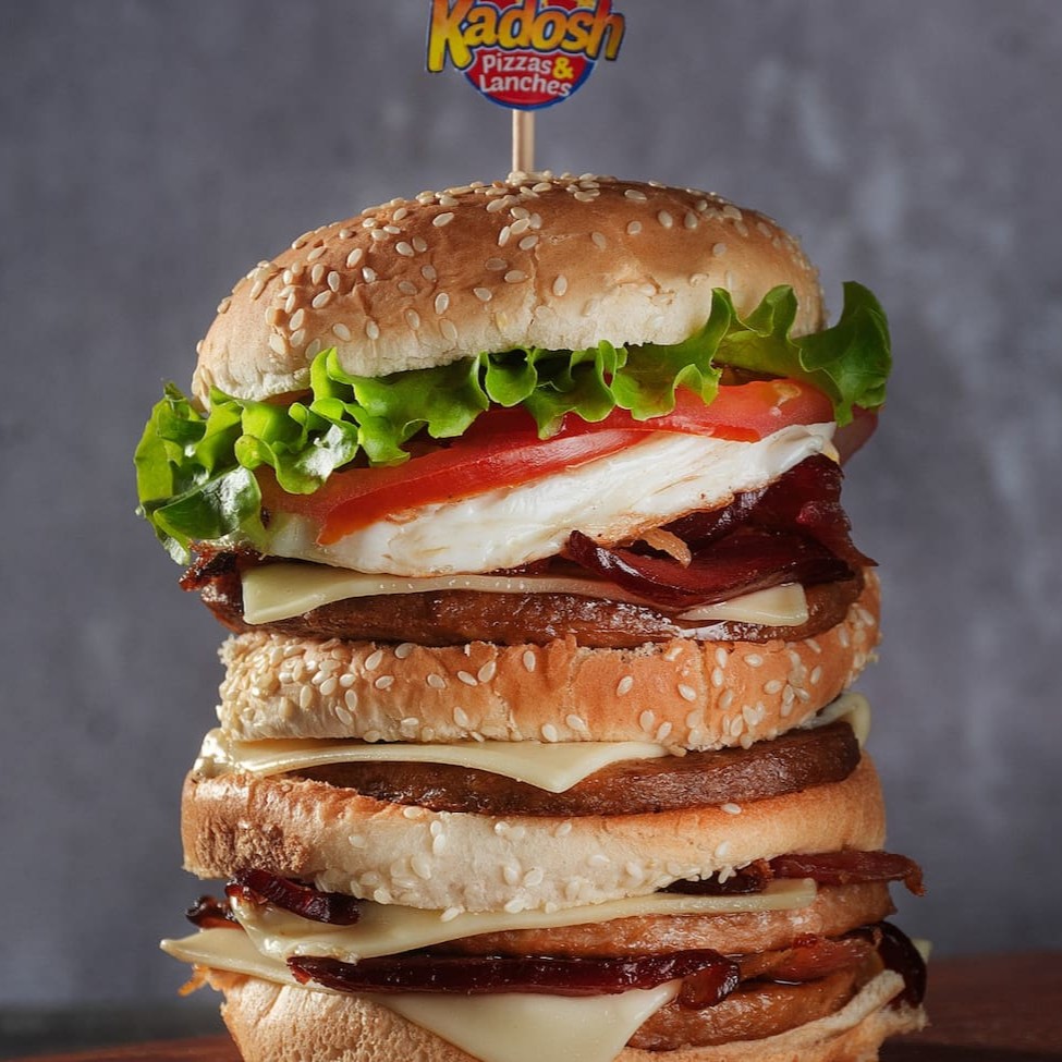 3 Pães, 3 carnes, 2 queijos, 3 presuntos, 1 Cheddar, Calabresa, Bacon,ovo, salada e Molho Especial + batata pequena + guaravita