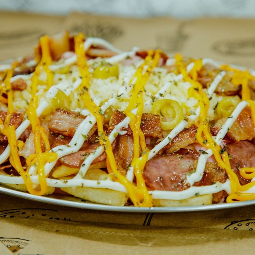 Batata Mccain de 7mm + calabresa + Catupiry Santa maria + cheddar Santa Maria + mussarela + presunto + azeitona verde + oregano + depois vai tudo para o forno Gratinar.