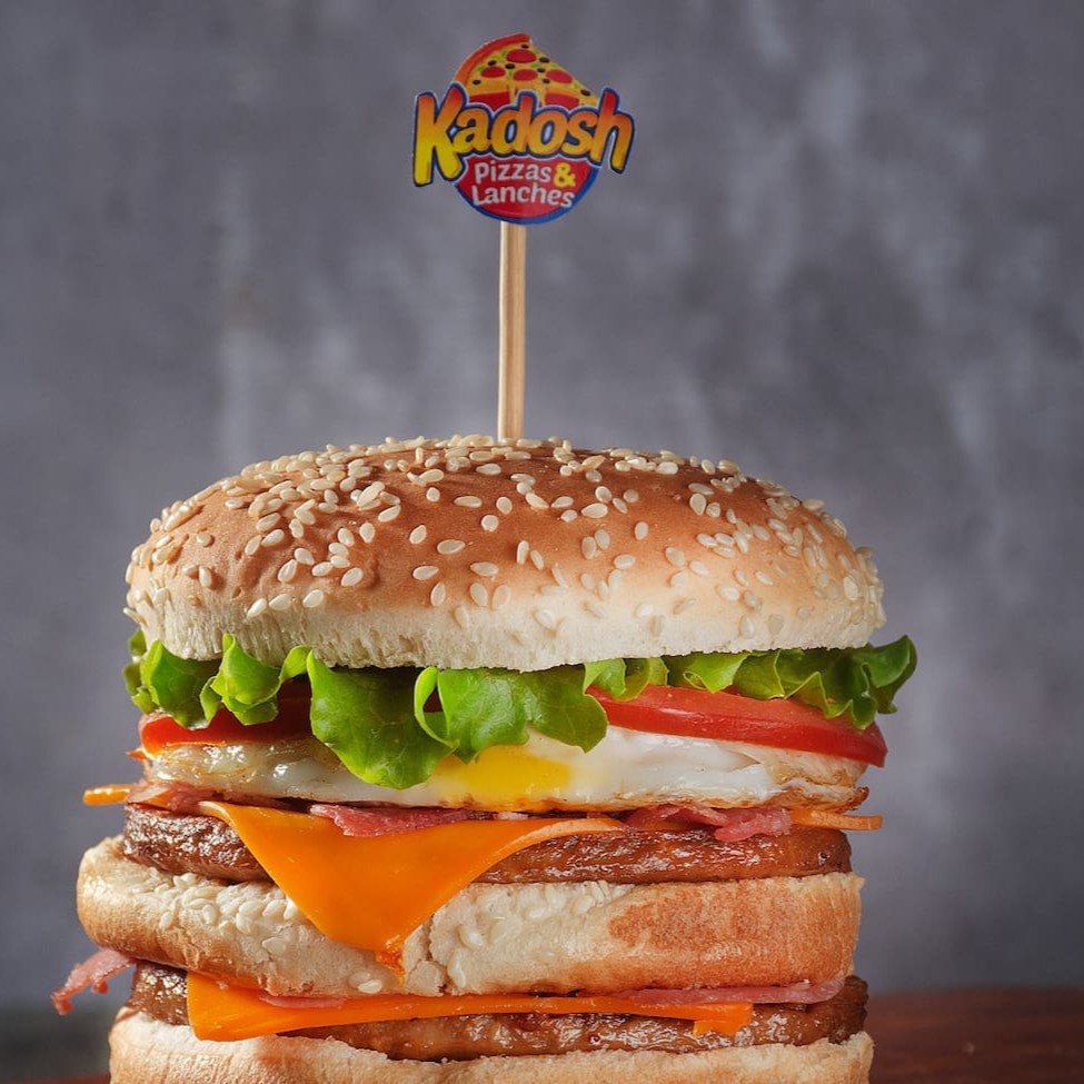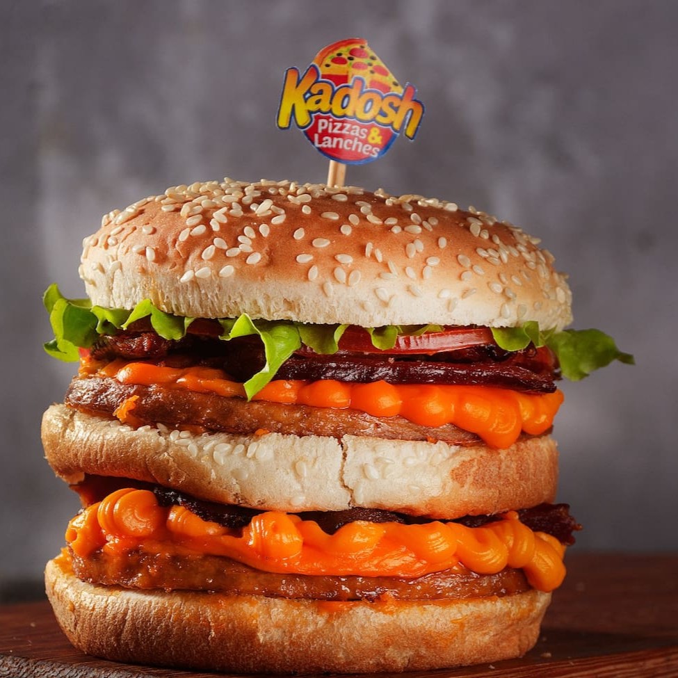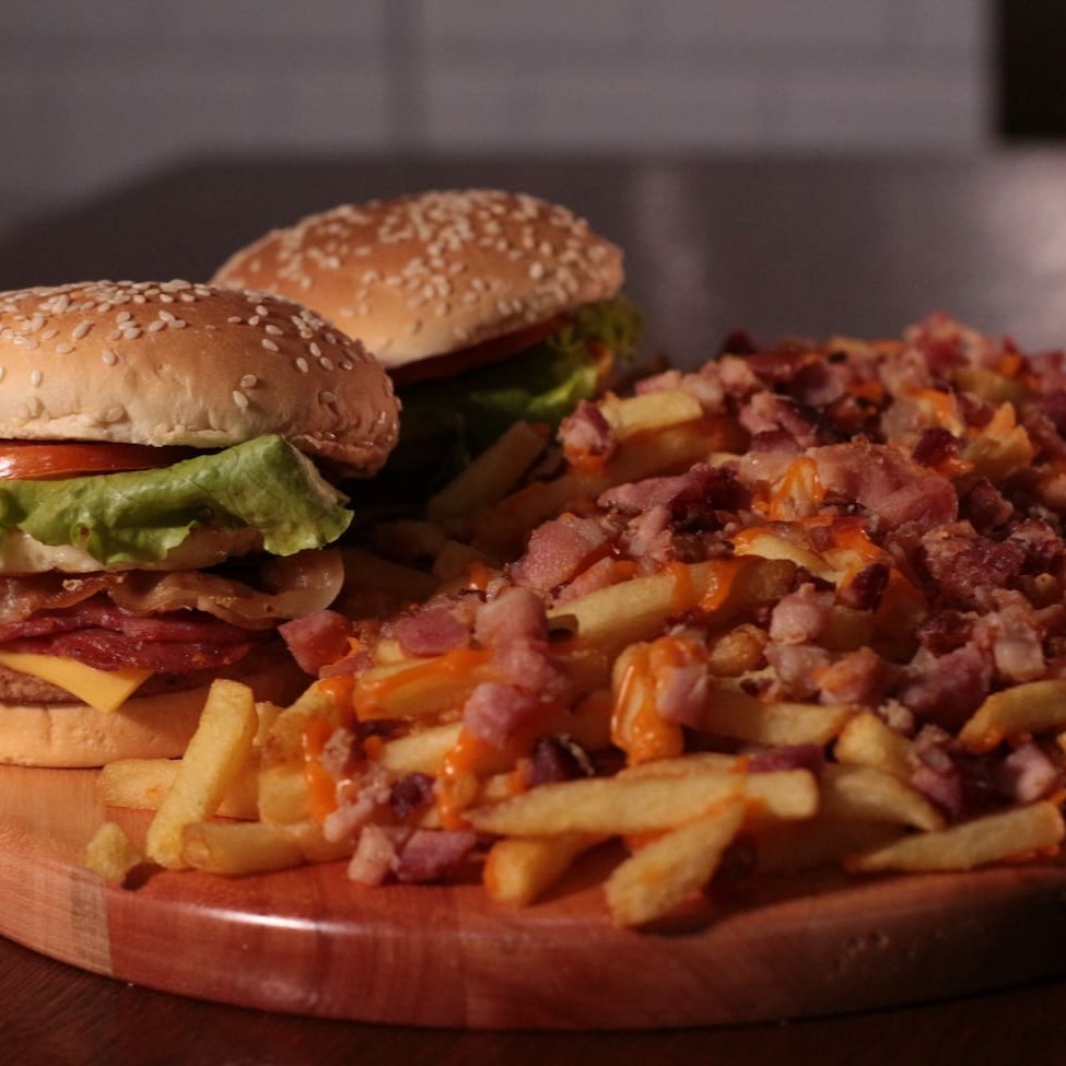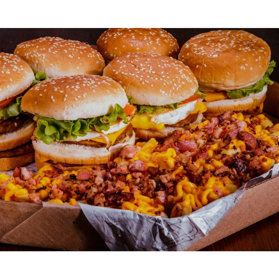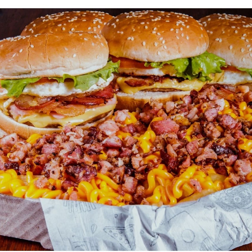 2 pães, 2 carnes, 2 quejos cheddar, 2 presuntos, ovo, salada e molho especial. batata maluca, cheddar e bacon.