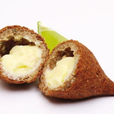 Delicioso kibe frito recheado com requeijão e bacon em cubos.