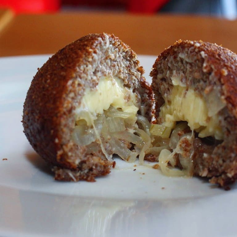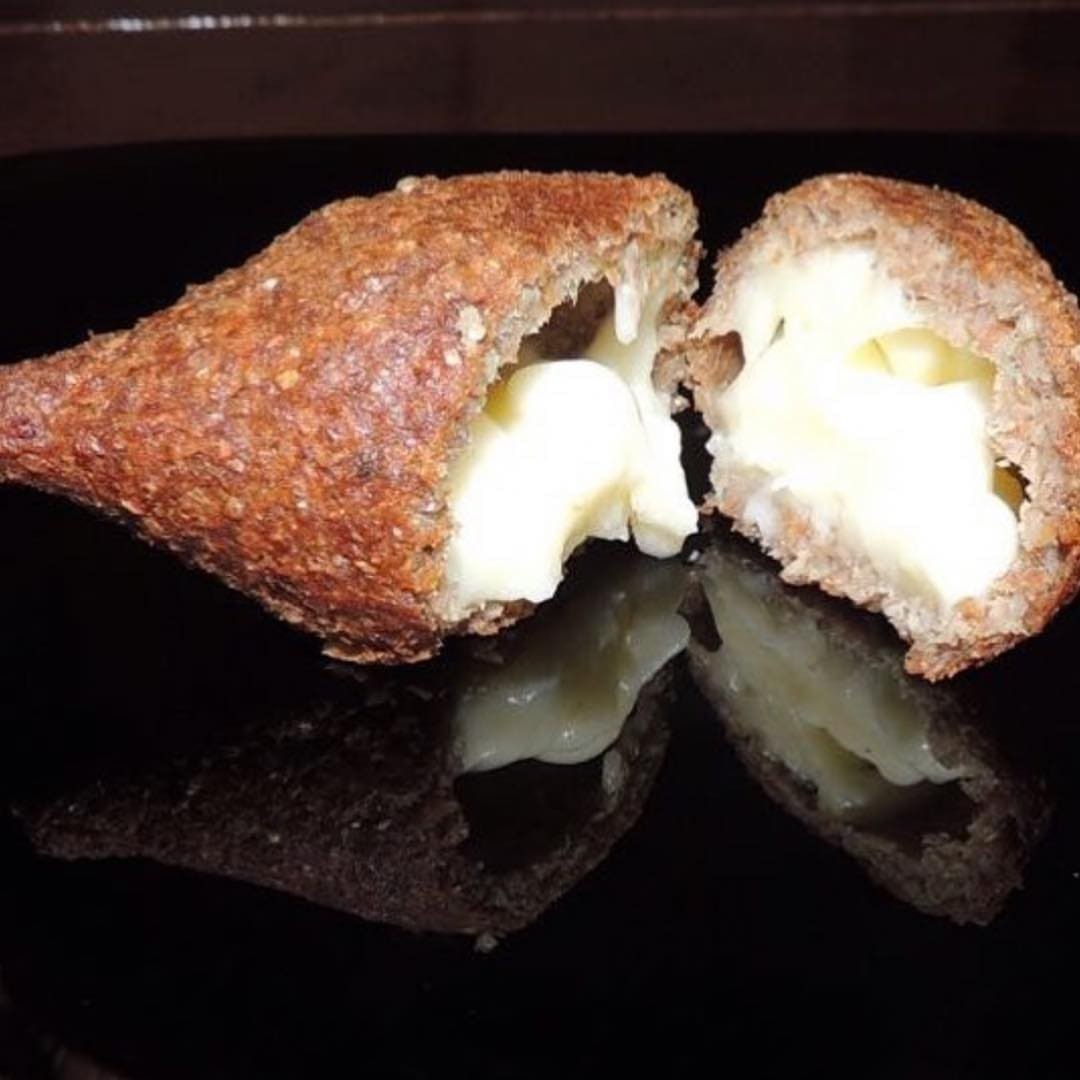Delicioso kibe frito recheado com requeijão e cebola caramelizada.
