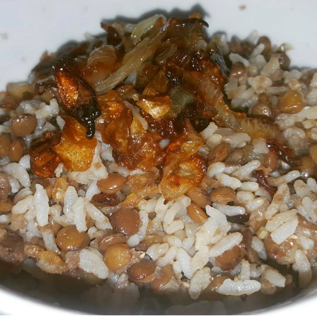 Porção de 500g de arroz com lentilha, acompanhado de nossa tradicional cebola caramelizada.