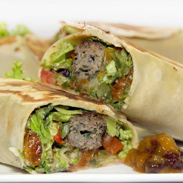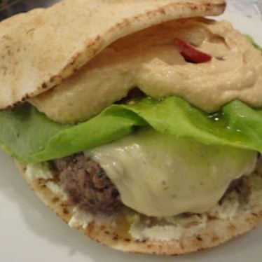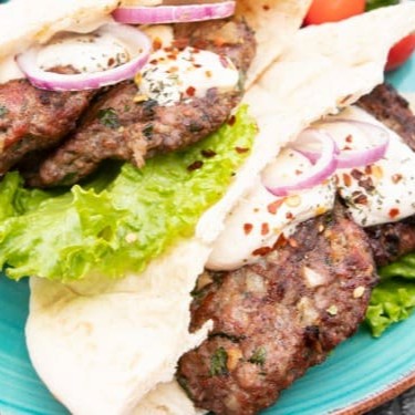 Pão árabe, kafta de 200g, em forma de hambúrguer, recheada com cebola caramelizada. Acompanha 100g de queijo, creme de alho da casa, alface e tomate.