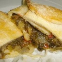 Esfiha de berinjela, com pimentões vermelho e amarelo, alho, cebola e passas brancas e pretas