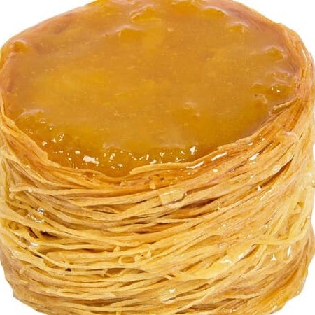 Macarrão árabe-kneff, doce de damasco e calda.