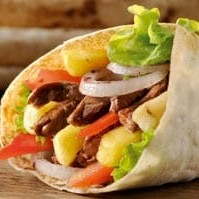 Pão árabe, 120g de iscas de filet mignon, 100g de queijo, creme de alho caseiro, cebola, alface, tomate e 150g de batata frita. Observação: A batata frita acompanha o sanduíche no recheio. Caso deseje, solicite na observação que a batata frita seja enviada à parte.