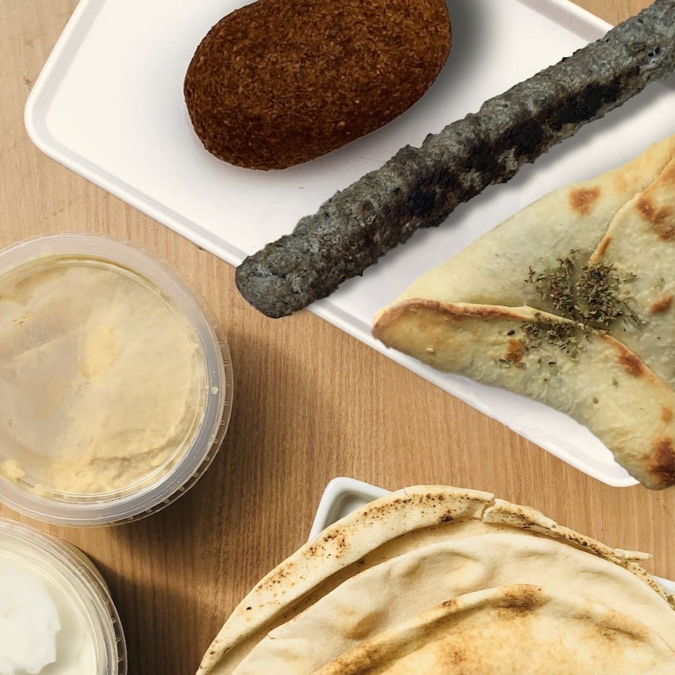 Combinado contendo 2 pastas árabes de 250g + 2 pães árabes grandes + 1 kafta grande com cebola caramelizada + 1 kibe frito + 1 esfiha fechada.