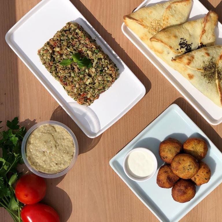 Combinado contendo 6 bolinhos de falafel (com creme de alho caseiro) + 1 pasta árabe de 250g + 2 pães árabes grandes + 1 tabule + 3 esfihas fechadas.