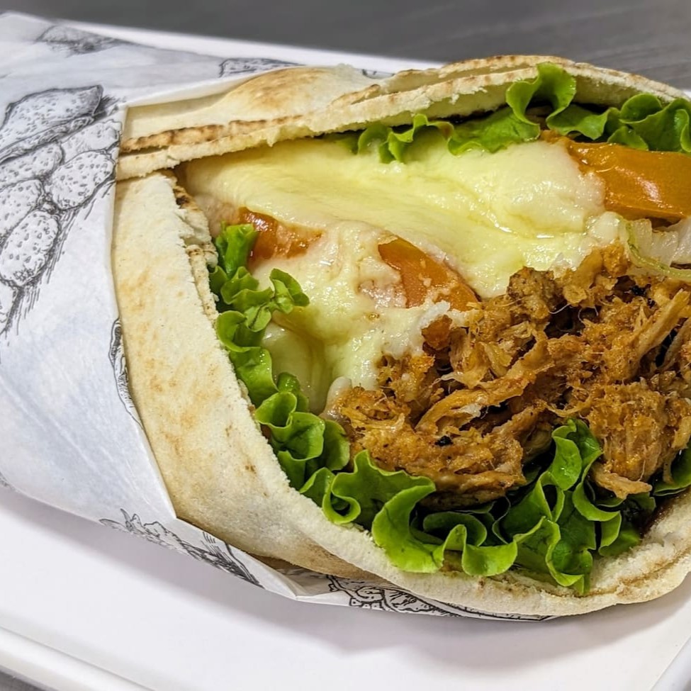 Sanduiche prensado no pão árabe com 120g de iscas de frango, 100g de queijo, alface, tomate e creme de alho da casa.