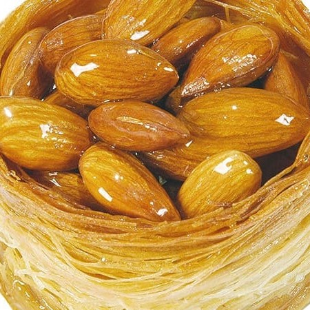 Macarrão árabe-kneff, amêndoa e calda.