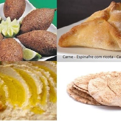 Combinado contendo 6 kibes fritos + 6 esfihas fechadas + 1 pasta árabe de 250g + 3 pães árabes grandes.