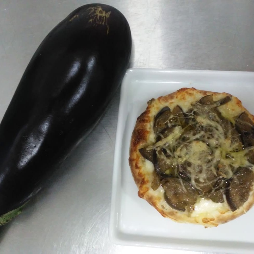 Berinjela marinada no alho e azeite temperado, mozarela tradicional e um toque de parmesão