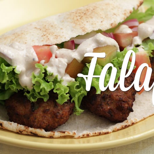 Pão árabe, bolinhos de falafel, molho agridoce, alface e tomate.