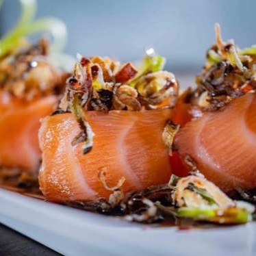 Pele de Salmão, cream cheese, cebolinha, gergelim, arroz, alga e molho teriaki. Sushi
