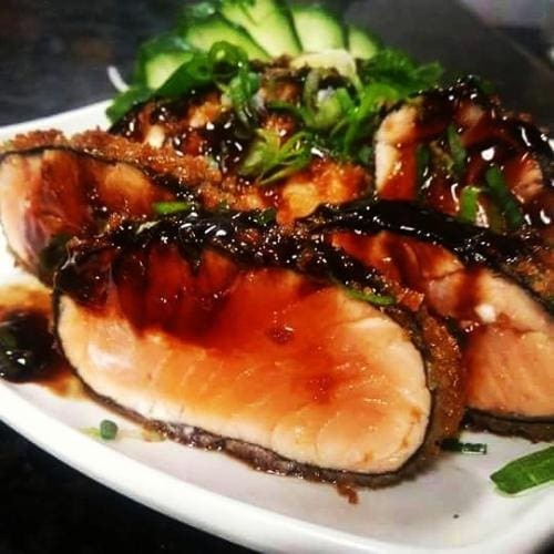 Atum empanado com flocos de arroz, servido com molho teriaki