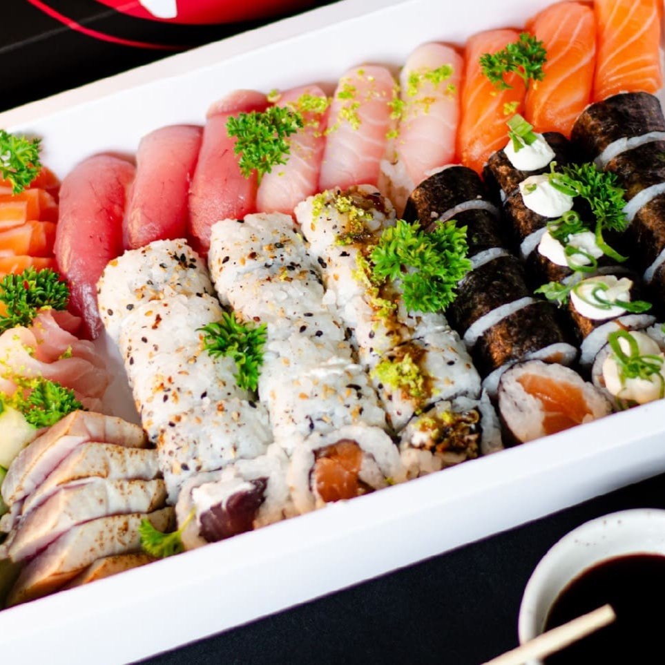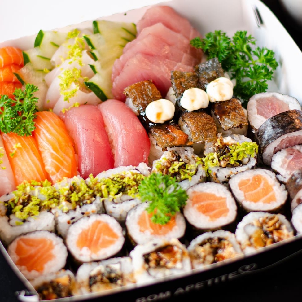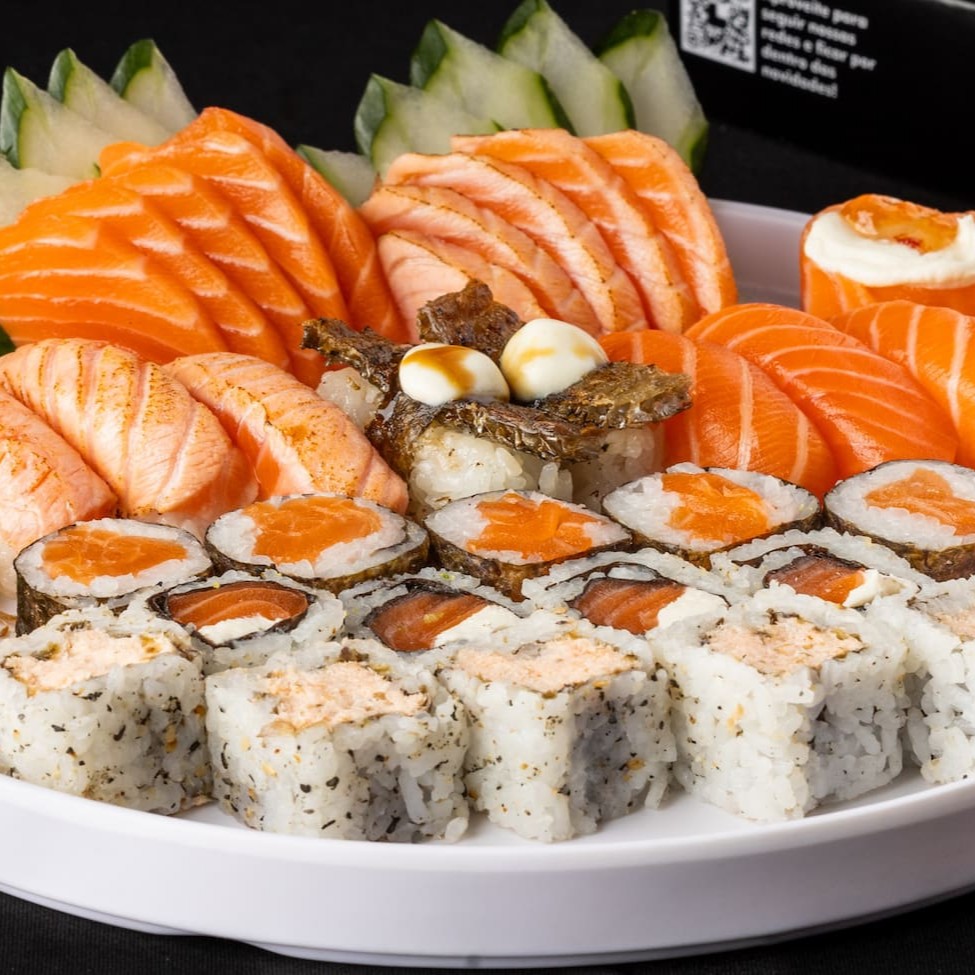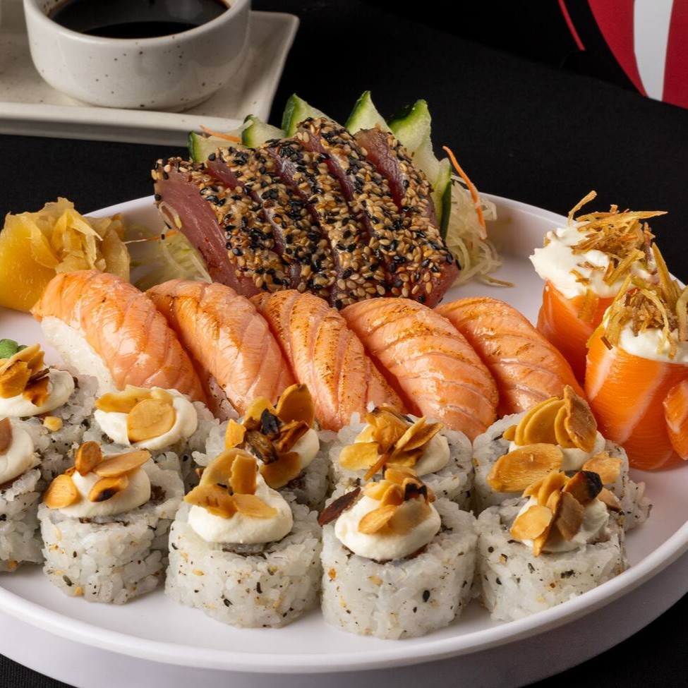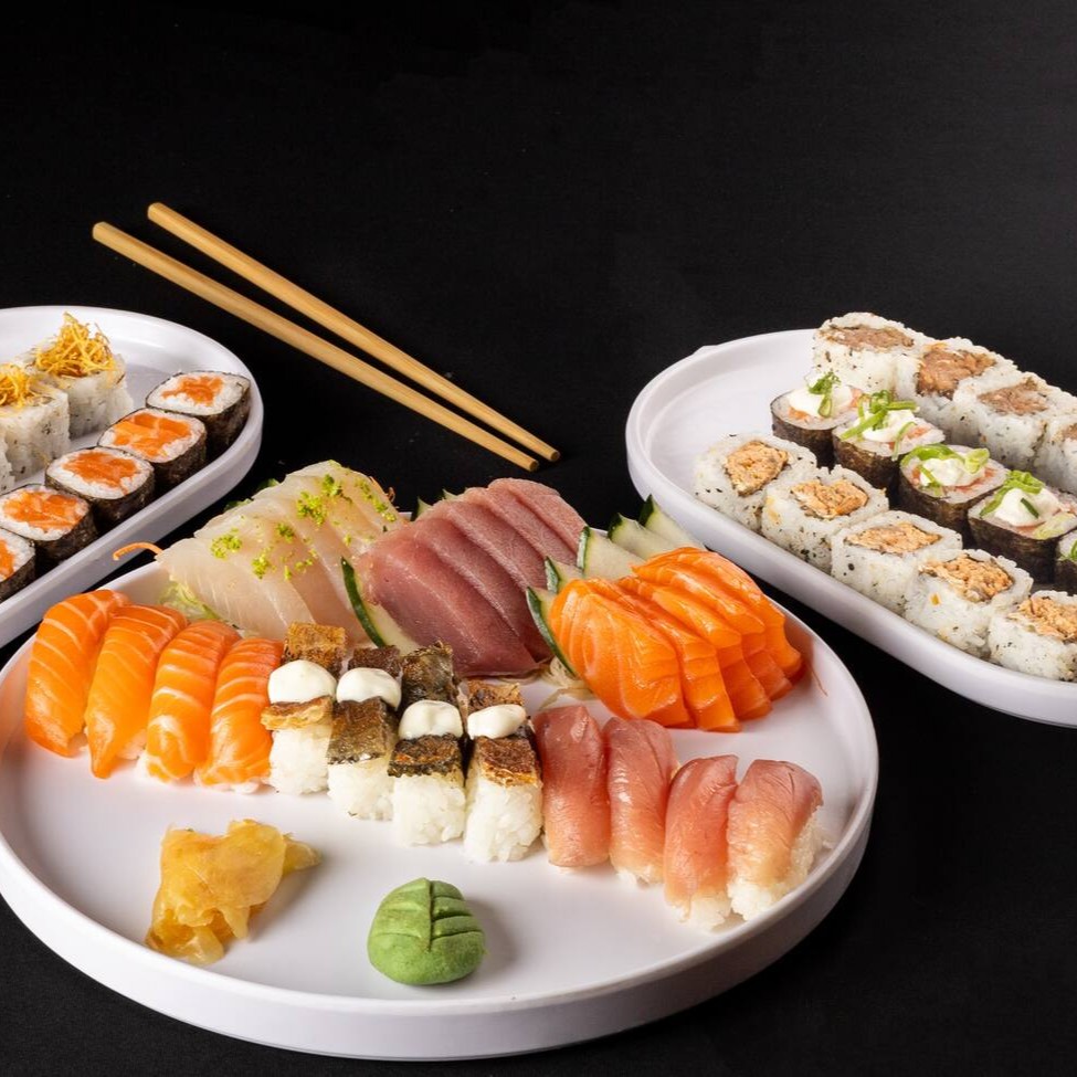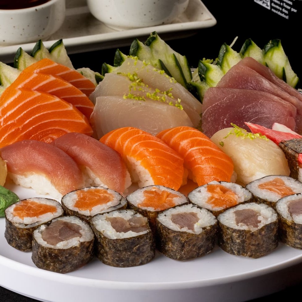 Combo delicioso onde você escolhe 4 porções de sashimi, 4 duplas de sushi, 3 duplas de gukan e 10 un de makimonos.