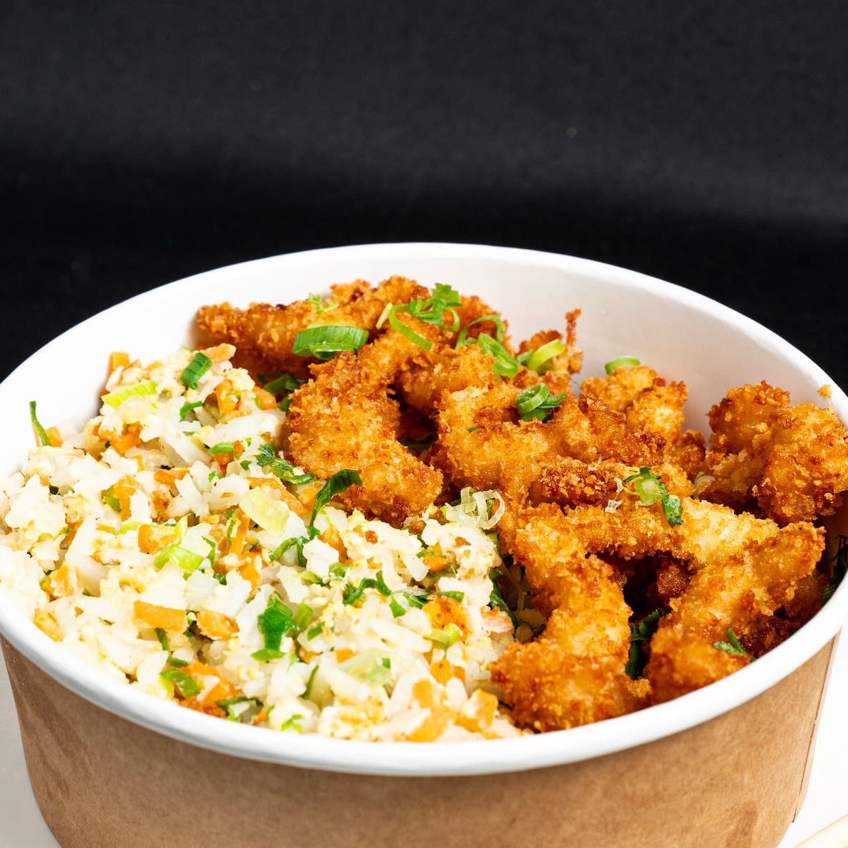 Arroz colorido com ovo mexido, adicionado um tempero especial do Chef! Com pedaços deliciosos de frango Ou camarão empanado, em farinha crocante.