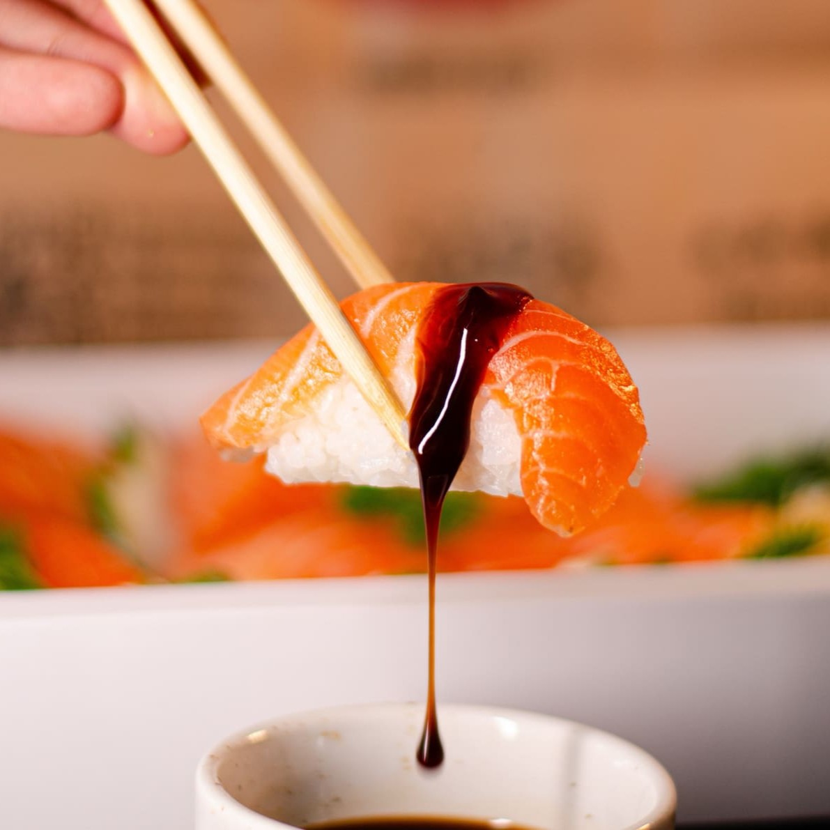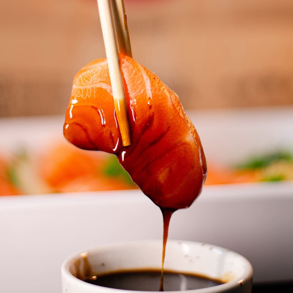 5 un de sashimi de salmão ou atum selados na crosta de gergelim ou togarashi (pimenta japonesa).
