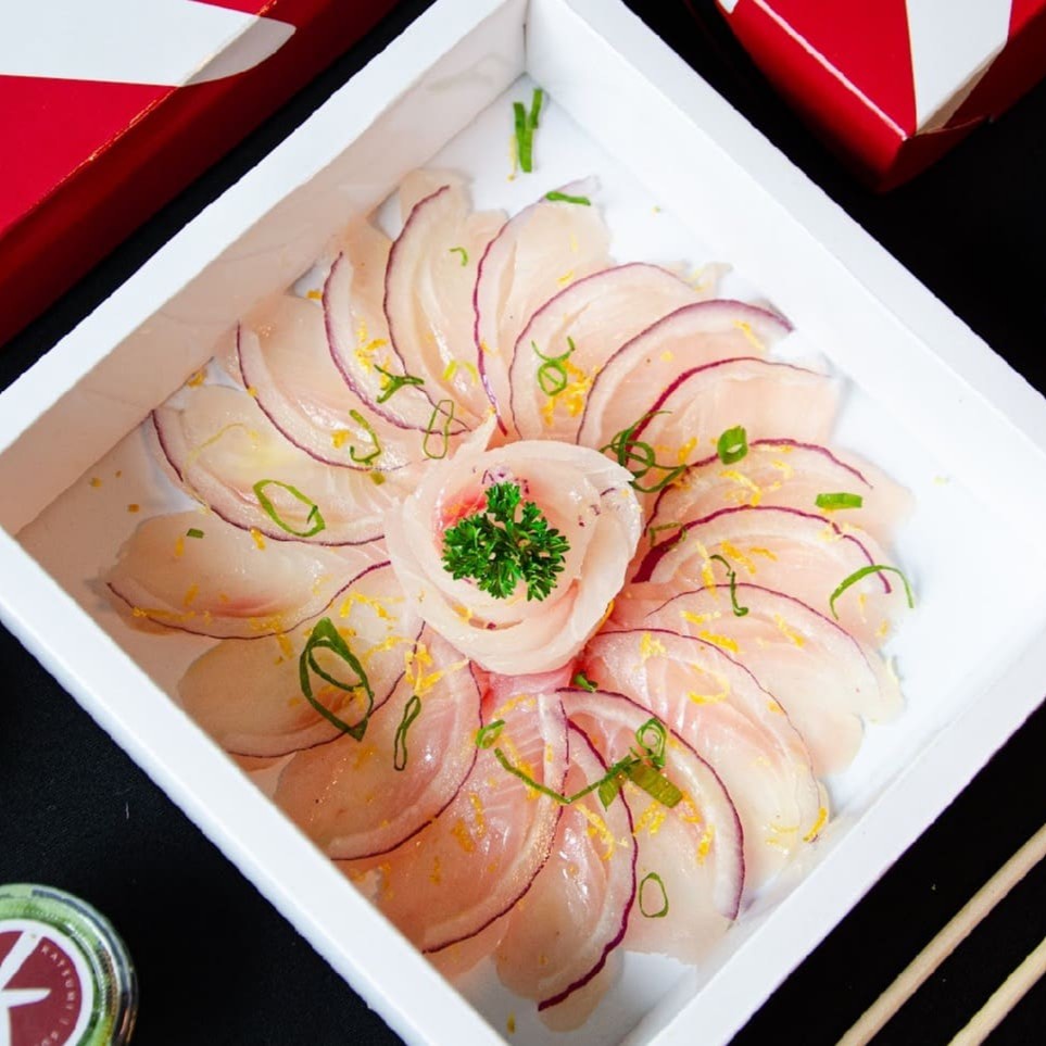 finas fatias de peixe branco fresco (do Dia) com azeite, flor de sal, cebola roxa, cebolinha e raspas de limão.