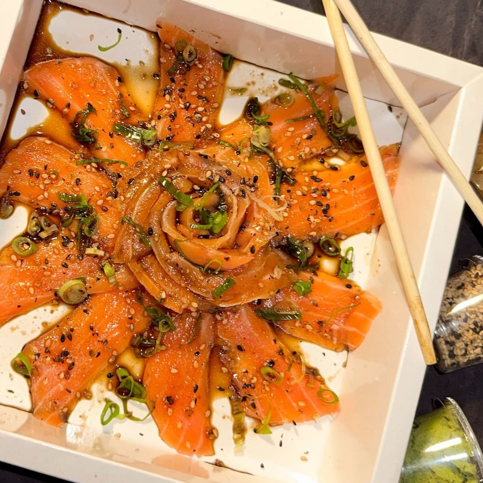 São deliciosas fatias de salmão ao molho cítrico japonês com gergelim e cebolinha.