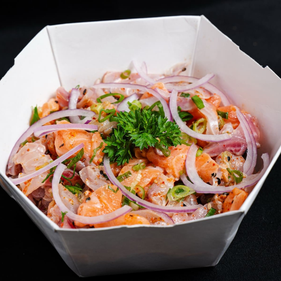 Mix de peixes em cubos marinado no limão com azeite, cebola roxa, pimenta e gergelim.