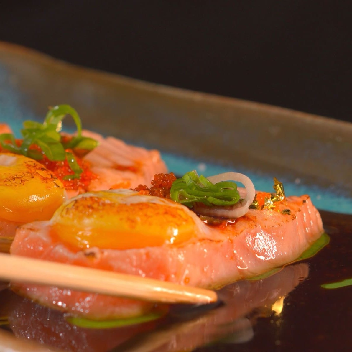 São 4 unidades extremamente Saborosas de sashimi de Salmão finalizadas com azeite, flor de sal, ovo de codorna, ova de massago, cebolinha e folha de arroz dourada (similar a ouro).