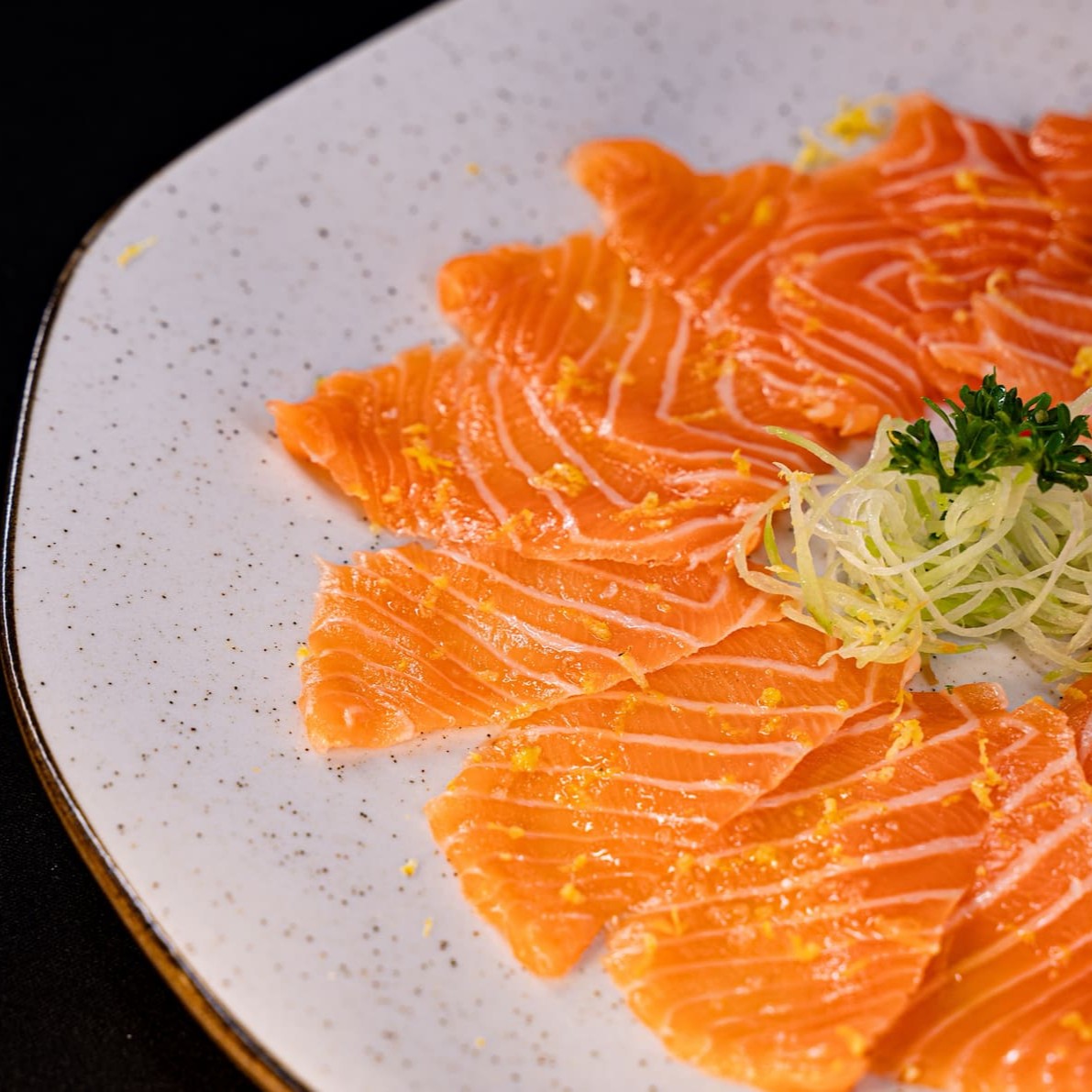 fatias finas, azeite, limão siciliano e flor de sal. Sabores refinados no seu pedido.