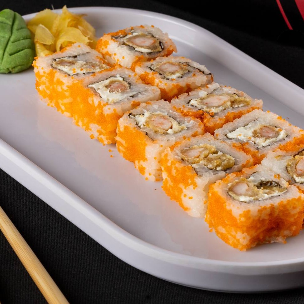 10un - Roll com recheio de camarão empanado, cream cheese, arroz por fora e Ova De Massago.