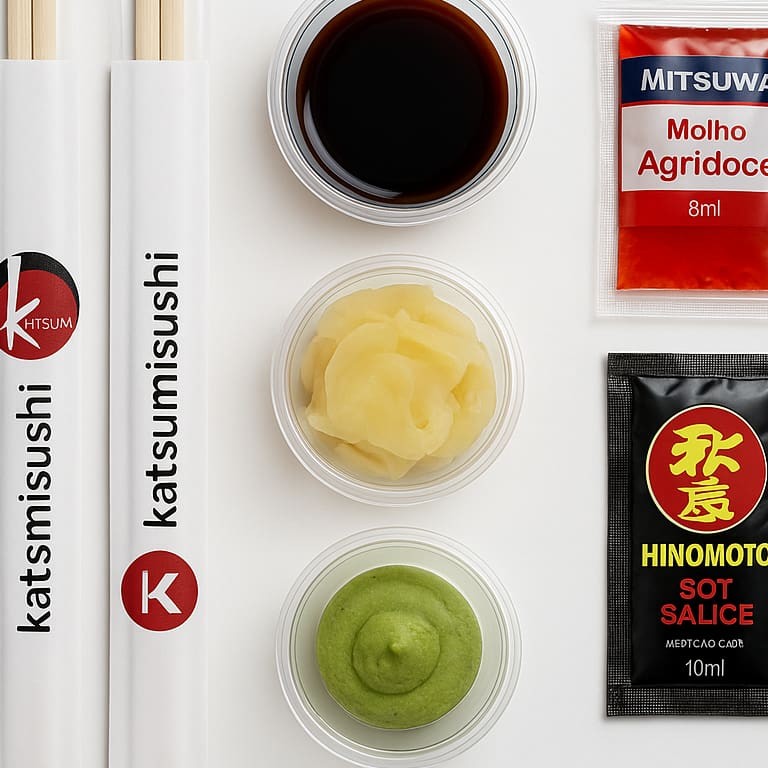 Nosso kit padrão acompanha: 2 pares de hashis Shoyu (para sushis e yakisobas) Molho agridoce (para harumakis) Teriyaki (para pratos fritos) ️Atenção: Gengibre e wasabi são enviados somente quando solicitados no campo de observações. Molhos extras e complementos estão disponíveis logo abaixo!