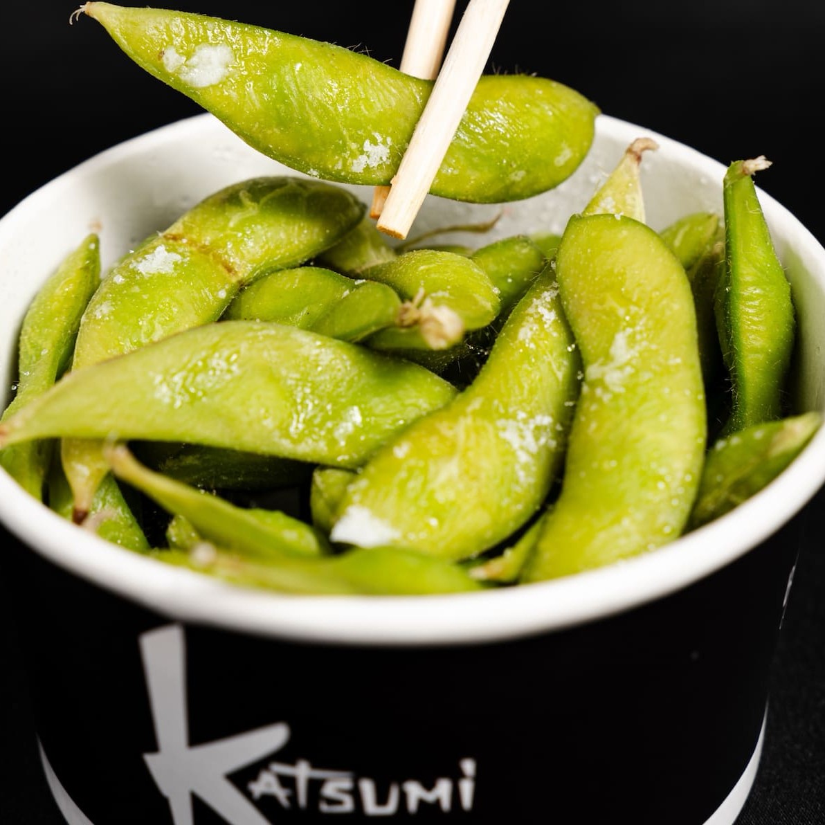 Edamame são grãos nobres de soja preparados cuidadosamente em nossa cozinha, cozidos em temperatura controlada e finalizado com flor de sal.