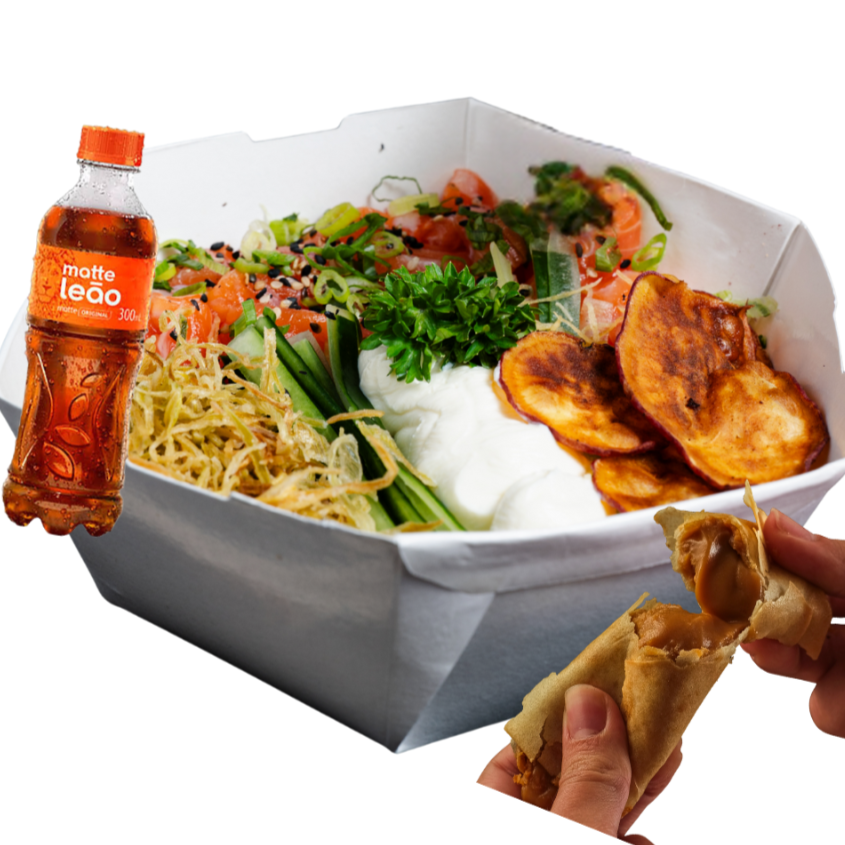 Prato principal: Poke (400g) com 100g de salmão, cebolinha e gergelim, base de arroz e 4 complementos: cream cheese, crispy de batata-doce, crispy de couve e cenoura. Bebida: 1 Matte Leão tradicional. Sobremesa: 1 Harumaki Doce de Leite. Atenção: Item promocional sem alterações. Imagem meramente ilustrativa.