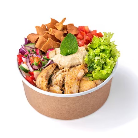 O nosso irresistível Salad Bowl de Frango, é uma opção saudável, leve e deliciosa, perfeita para quem quer saborear nosso frango especialmente preparado. Esse prato é uma explosão de frescor e sabor. Ideal para saciar sua fome de forma equilibrada, ele vai transformar seu Dia. Comece escolhendo uma pasta - saboroso Homus ou cremoso Aioli. Acrescente ingredientes frescos: Alface, Tomate, Mix de Salada Fattouche (Pepino, Rabanete, Pimentão, Cebola Roxa, Salsinha, Hortelã, Molho Vinagrete e Torradas). Cada ingrediente foi selecionado para complementar e elevar o sabor da sua salada. Recomendamos escolher completo! Finalize com um de nossos molhos exclusivos: tahini, pimenta da casa ou alho da casa, para dar aquele toque final que faz toda a diferença.