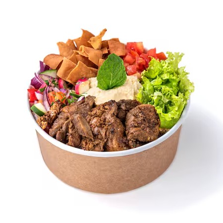 O Salad Bowl de Carne é a opção saudável e deliciosa para quem quer o melhor do Kebab de forma leve. Com cortes magros marinados por 24h em temperos especiais e assados lentamente, cada mordida é uma explosão de sabor. Combinado com o mix fresco de nossa salada, é a escolha ideal para um Dia leve, refrescante e cheio de sabor. Comece escolhendo uma pasta - saboroso Homus ou cremoso Aioli. Acrescente ingredientes frescos: Alface, Tomate, Mix de Salada Fattouche (Pepino, Rabanete, Pimentão, Cebola Roxa, Salsinha, Hortelã, Molho Vinagrete e Torradas). Cada ingrediente foi selecionado para complementar e elevar o sabor da sua salada. Recomendamos escolher completo! Finalize com um de nossos molhos exclusivos: tahini, pimenta da casa ou alho da casa, para dar aquele toque final que faz toda a diferença.